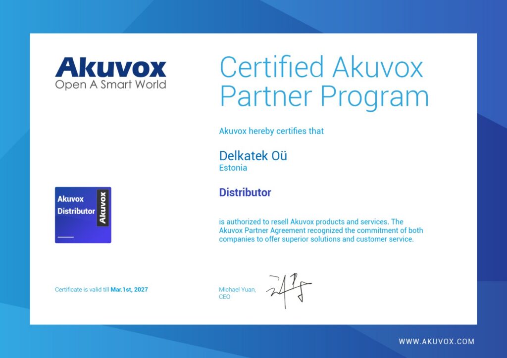 Akuvoxi lahenduste ametlik maaletooja nii Eestis, Lätis kui ka Leedus oleme meie. See tähendab, et meie töö ei piirdu vaid seadmete müügiga, vaid me oleme otseses kontaktis tootjaga, tunneme süsteeme süvitsi ning saame pakkuda igakülgset tuge alates esimesest küsimusest kuni lahenduste igapäevase toimimiseni. Meiega kaasneb kindel tarneahel, toimiv garantii, ajakohane tarkvara ning ligipääs kohalikule pilveteenusele. Kui midagi vajab seadistamist või uuendamist või tekivad muud küsimused, saab just meilt vajalikku abi ja tuge.